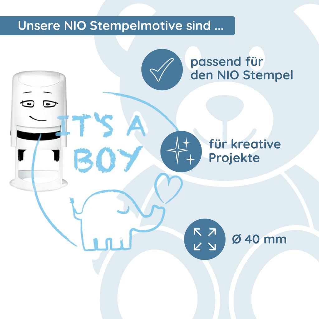 You already have a NIO stamp and want a new design? A birth or baby shower coming up? Then we have the perfect text plate "It´s a boy" for you. Also order the matching stamp pad in "calm blue".