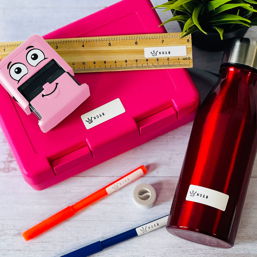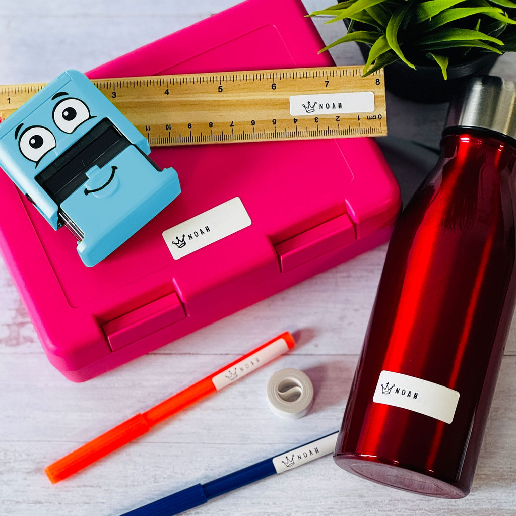 MARKY kann direkt auf hellen Stoffen, Papier, Karton, Schuhen und auf allen saugfähigen Oberflächen verwendet werden. Für die Personalisierung von dunklen Stoffen enthält das Set ein 1 Meter langes Thermo Bügelband, das nach dem Stempeln aufgebügelt wird. Trinkflaschen, Brotdosen, Stifte, Scheren und viele andere Schulsachen, die nicht direkt bestempelt werden können, werden mit den MARKY-Etiketten personalisiert. Die Etiketten dürfen dann gemeinsam mit Trinkflasche und Co. in die Spülmaschine.