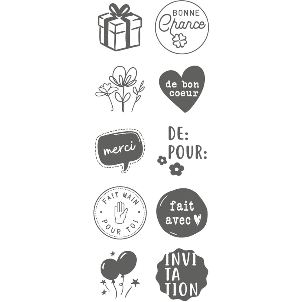 In diesem Set sind 10 verschiedene Stempelplatten enthalten, die zum Thema Französisch passen, einfach austauschen