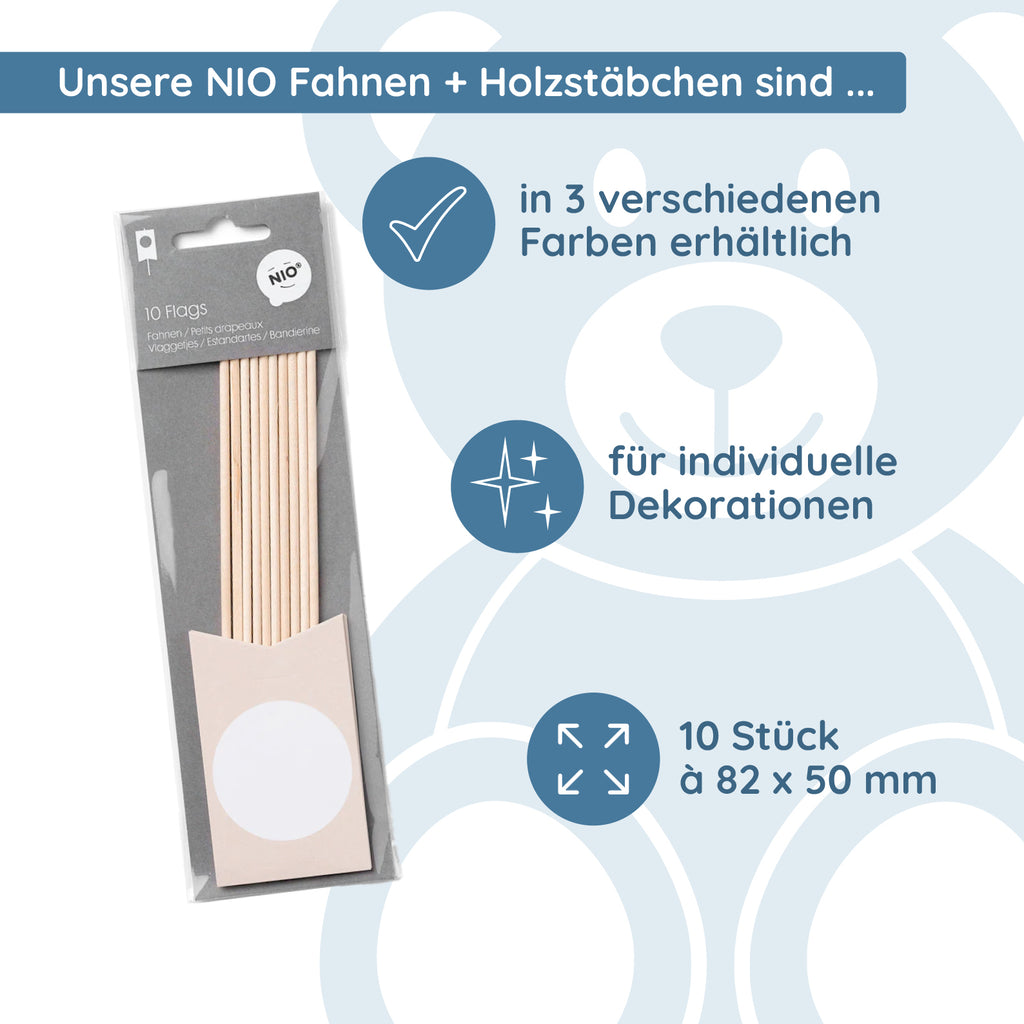 Sie suchen noch nach dem „Topping“ für Ihre Blumen, ihre Cupcakes oder Ihre Tischdeko? Dann haben wir mit der NIO Fahne in
