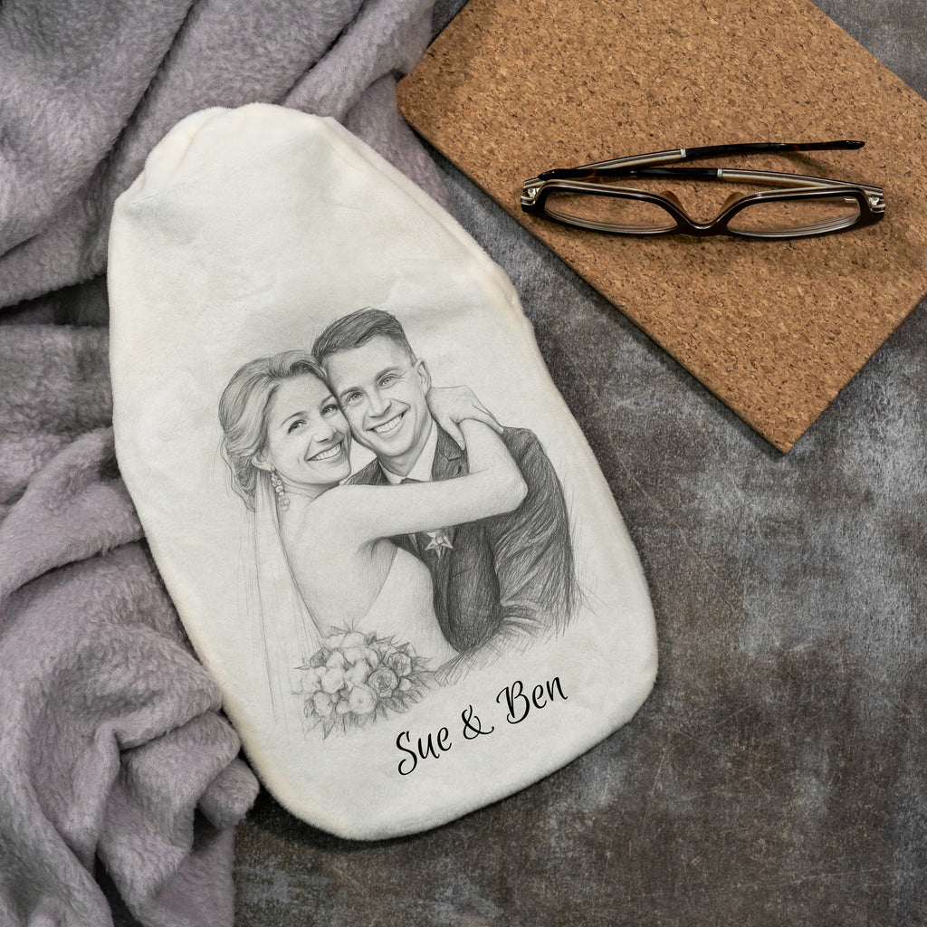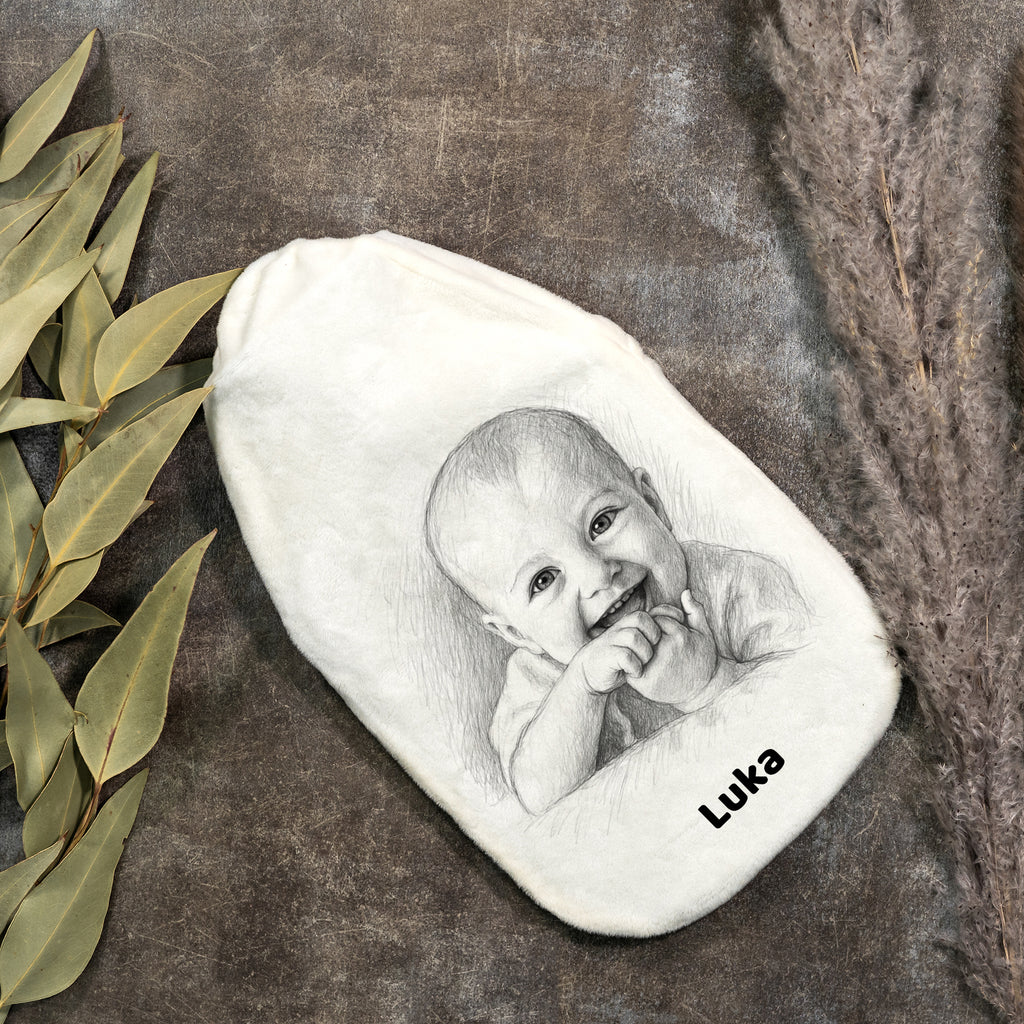 Diese persönliche Wärmflasche 🔥 sieht nicht nur toll aus, sondern spendet auch wohltuende Wärme. Lade einfach Dein Foto hoch 📸 – wir verwandeln es in eine detailreiche Bleistiftzeichnung ✏️, die zusammen mit Deinem Wunschtext auf den weichen Bezug gedruckt wird. So entsteht ein stilvolles Einzelstück, das Wärme und Persönlichkeit perfekt verbindet.