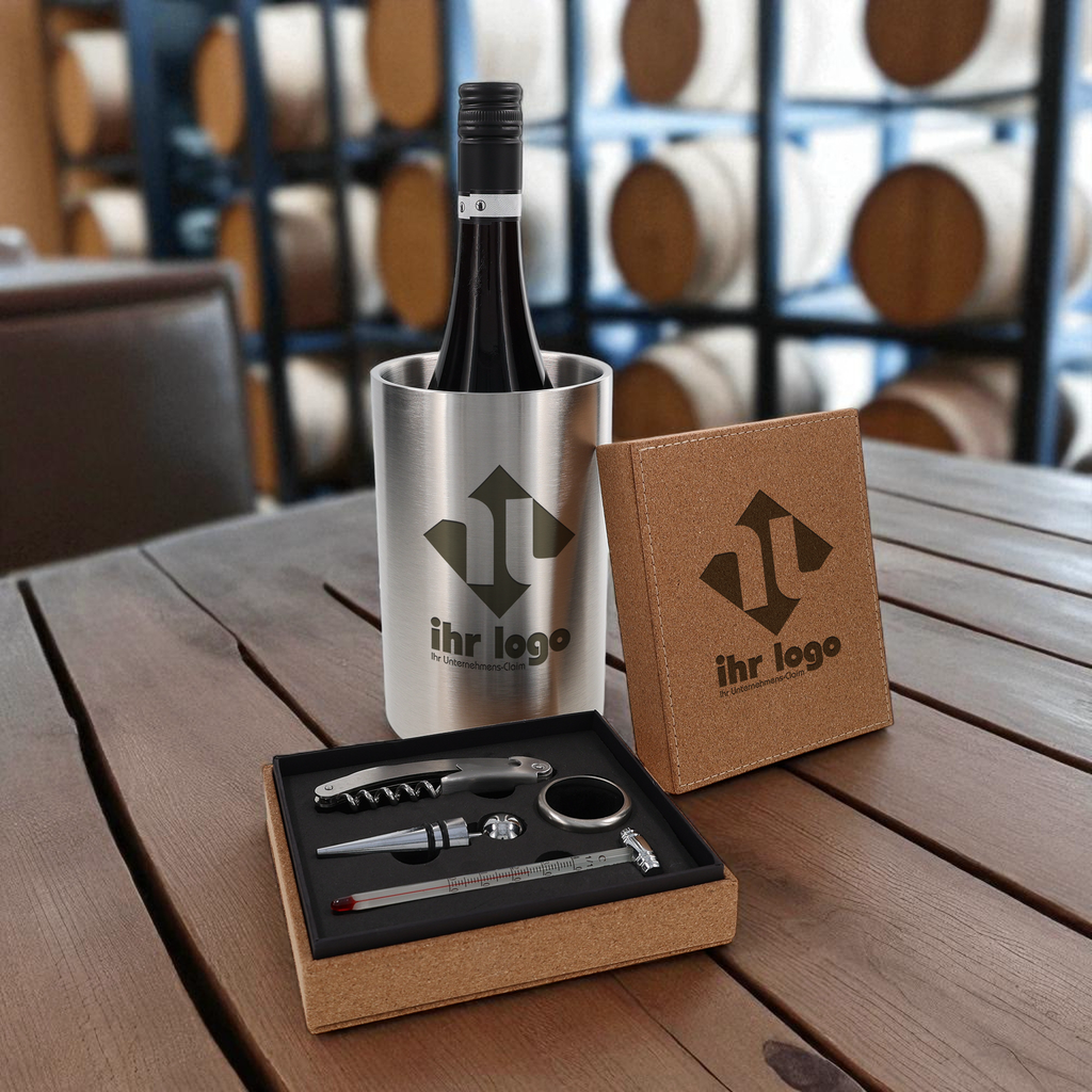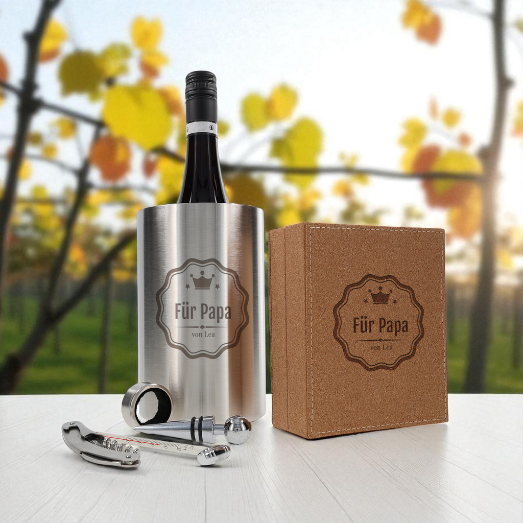 Der doppelwandige Weinkühler präsentiert die Weinflasche nicht nur gekühlt, sondern auch stilvoll – perfekt für entspannte Stunden oder feierliche Anlässe. Die ergänzenden Accessoires erleichtern das Öffnen, Eingießen und Abschließen der Flasche – ein Komplettpaket für echten Genuss. Und das Beste: Durch die Gravurmöglichkeit wird das Ganze zu einem persönlichen Highlight – ob mit Namen, Datum oder Firmenlogo.