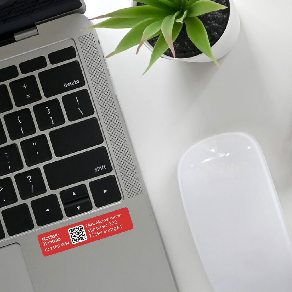 Die Aufkleber enthalten deinen Namen, Telefonnummer und Adresse im Klartext sowie zusätzlich als QR-Code, sodass Helfer, Finder oder Kunden dich sofort kontaktieren können.